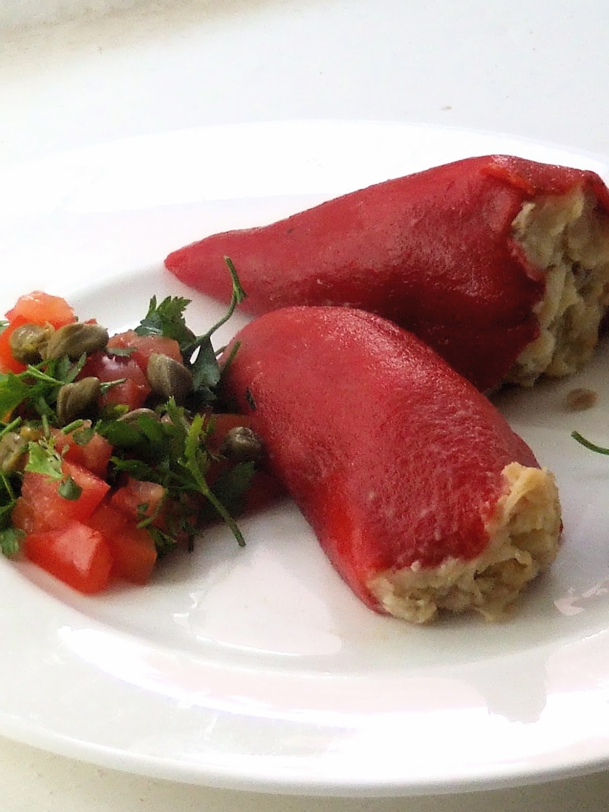 Extra butter for the mashed potato and for greasing the oven dish Melt the butter in a heavy based pan. Add the onions with a sprinkling of salt and cook slowly over a low heat.It will take 30 minutes or more for them to colour, though they should not brown. Meanwhile boil the potatoes, drain them and mash them adding the extra butter and then fold in the cooked onions.Check the seasoning and allow the mix to cool slightly.With a small spoon, carefully spoon the potato mixture into the peppers, pushing it gently right down to the tip of the pepper. Do not overfill as the peppers will split. Grease an ovenproof dish and lay the peppers in it side by side. Heat in a moderate oven for 10 minutes. Serve with a side salad of capers, finely diced tomatoes and parsley. To make your starter plate a tad more tempting try a brandade filling. This is a puree of salt cod, olive oil and cream which is a speciality of Languedoc and Provence. Similar preparations are made in many countries where dried cod is enjoyed, so a sure fire item on Portuguese Christmas menus.Venetian Baccala mantecato is one of the best known. However, most recipes include, even in France,a potato purée, although this is not a true brandade. Piquillo peppers stuffed with brandade serves 4