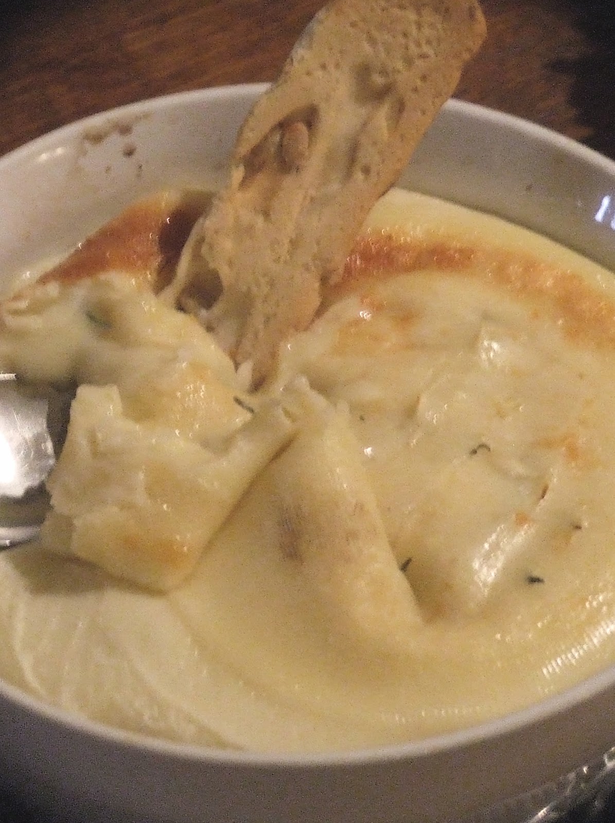 This is the new fondue- a whole melted cheese brought to the table in a dish and then everybody round the table can spoon, fork or dip crusty bread and bread sticks into this delicious runny stuff. A delicious starter or cheese course.