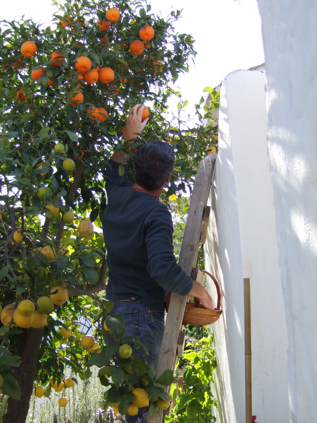To prepare for the new production I am required to scale a ladder and pick some fruit.