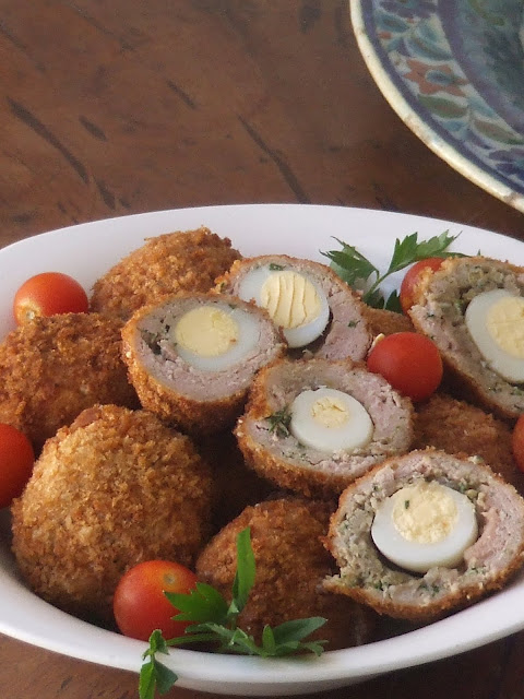 I am always drawn to recipes that have a historical reference, have travelled, suffered a transition through cultural compromise but survived the journey and kept their true identity. The Scotch egg started its journey in India. The Nargisi Kofta is the classic North Indian Scotch egg and dates back centuries. The Nargisi Kofta is a variation of the more coomon lamb kofta and is made from a combination of game meats - venison, hare and wild boar. Boiled eggs are encased in a keema mixture and the kofta/kebab which results is either deep-fried or put into a gravy and cooked as part of a curry. The combination of keema and egg should not necessarily work but it always does, whether in Scotch eggs or in Indian cooking.Over the years and continents nations have combined a variety of meats to make their own version, depending on what meat they had at their disposal.I am now so happy now to have re-discovered ovos à escocesa here in Portugal.