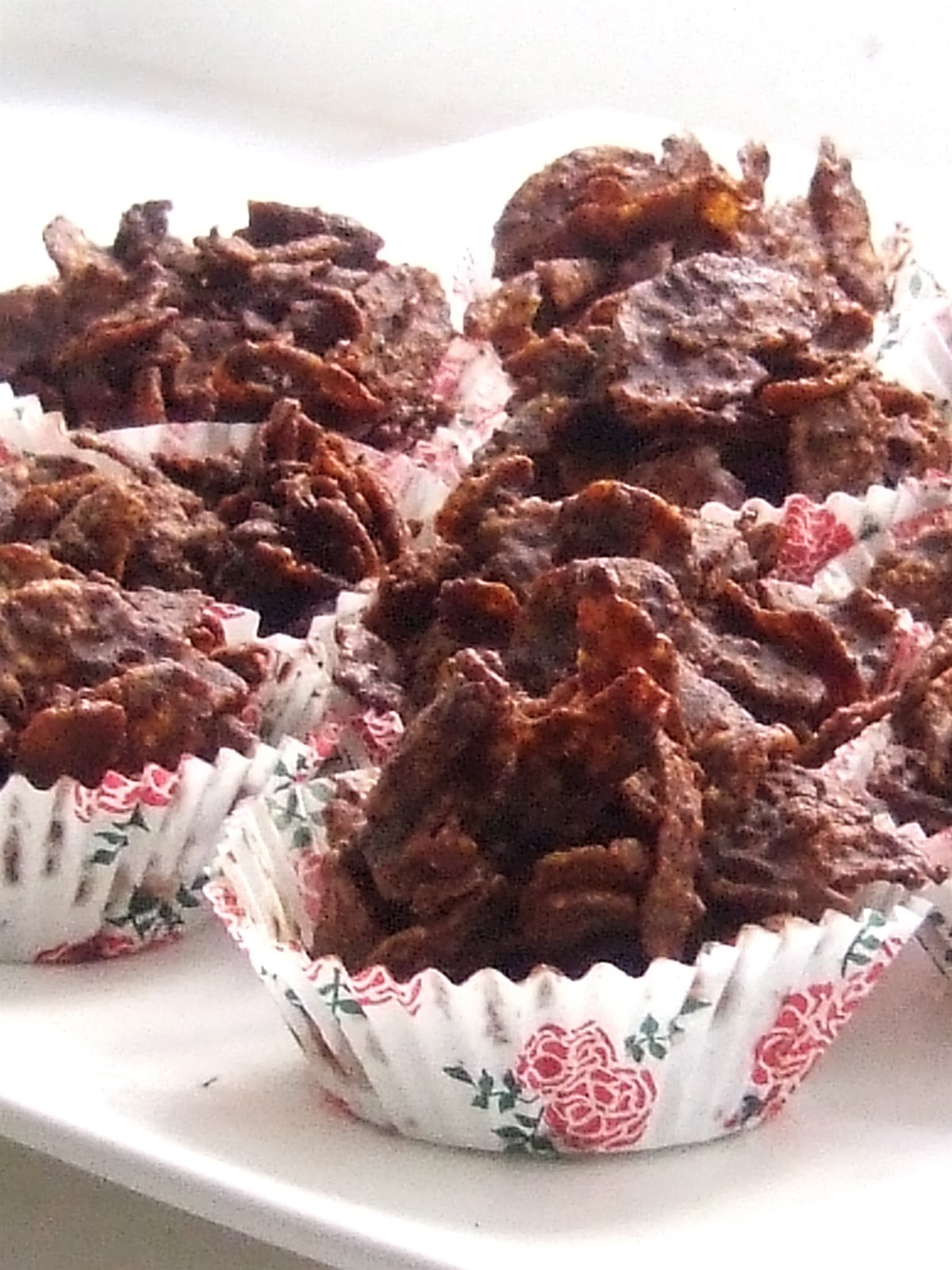 Yesterday our oven door broke, deeming the oven unusable.The technician came to assess the damage and took it away overnight with a pledge to return with the repaired door in the morning. Well the oven man nao cometh and today found us with a disabled oven.Dinner, which was supposed to have been baked in the oven, had to be deep fried.No loss of taste or quality there but more importantly it is Saturday, the rain has been chucking it down all day and finding myself in the kitchen I wanted a cake for an afternoon treat.I needed a no-cook cake.It is a common thing for people to hear the story of Peter Pan and Neverland and to think that they too never want to grow up.I am one of those, but age can be a funny thing, it sometimes manifests itself in foolish infatuations and guilty pleasures, and a return to childhood. One of my guilty pleasures is chocolate corn flake crispies.With no oven and yet another expat craving coming on, I decided to make this classic childrens tea party item. It is surprisingly difficult to find a recipe for these, but also surprisngly easy to make one up. Here´s what I did