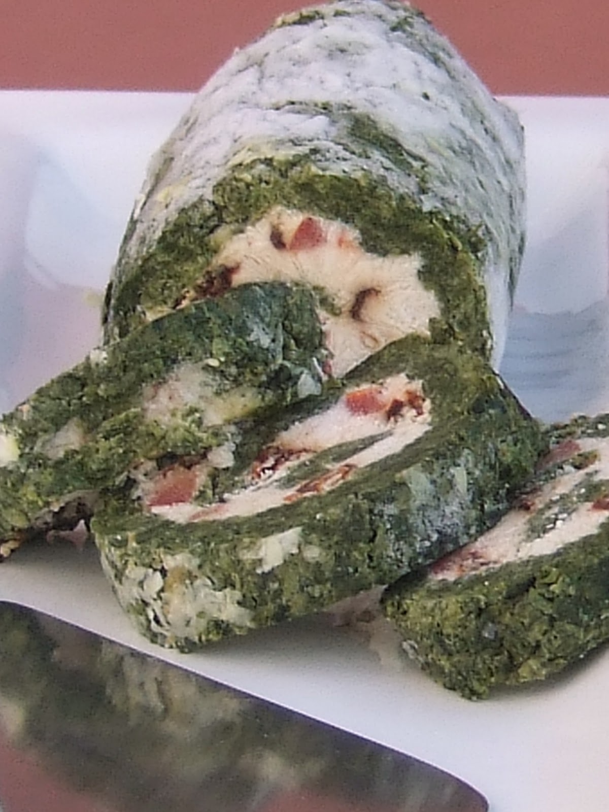 A roulade is like a souffle that has been run over, flattened by a steam roller, and then rolled up again around a filling, swiss roll style.It can be served hot with a sauce,more often than not tomato, or as in my recipe served cold. By choosing the right combination for your filling lady luck will be on your side and you will have a winner.If your three items are are well contrasted in texture and flavour,the final result will not only look but taste superb.This is what cooking is all about,a small change to what is expected,in this case my choice of cheese and transposing the tomatoes out of the would be sauce and into the filling,can alter a dish to great effect and give you a stunning centrepiece that is simple to make and sure to tempt vegetarians and meat eaters alike.