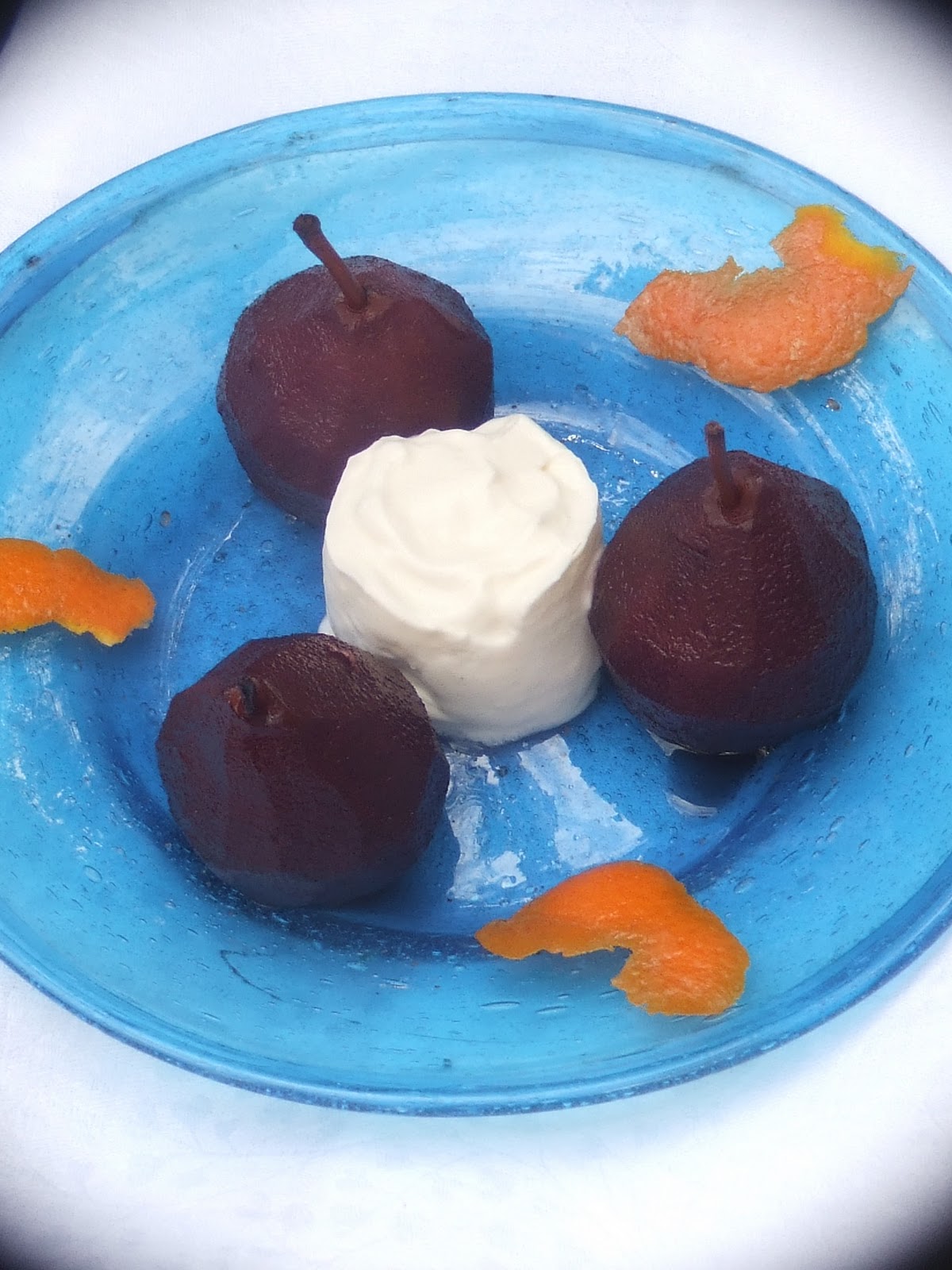 Baby Rocha pears poached in aromatised red wine